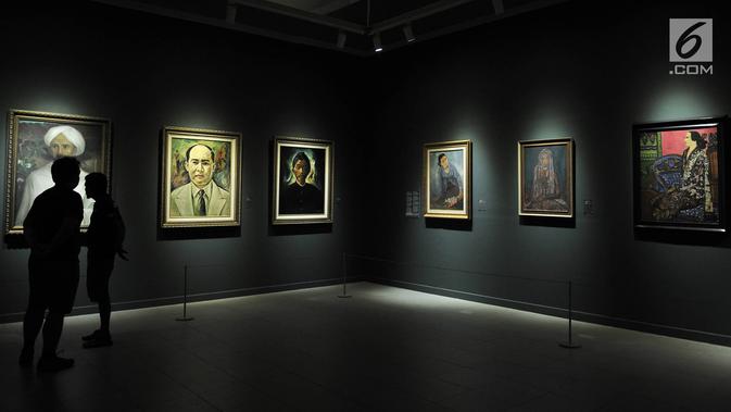 Pengunjung melihat sejumlah lukisan koleksi Istana Kepresidenan yang dipamerkan di Galeri Nasional, Jakarta, Senin (6/8). Pameran menampilkan 45 lukisan, patung, dan seni kriya dari 34 seniman Indonesia dan mancanegara. (Merdeka.com/Iqbal Nugroho)