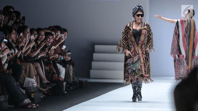 Menteri KKP, Susi Pudjiastuti memperagakan busana rancangan Anne Avantie pada Jakarta Fashion Week 2019 di Senayan City, Selasa (23/10). Melengkapi penampilan nyentriknya, Menteri Susi menggunakan kain tenun sebagai turban. (Liputan6.com/Faizal Fanani)
