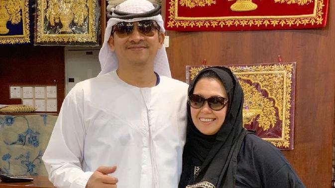 Dalam unggahan yang lain, Yenny menjajal busana tradisional Uni Emirat Arab, abaya hitam. Sementara, sang suami mengenakan kandura.