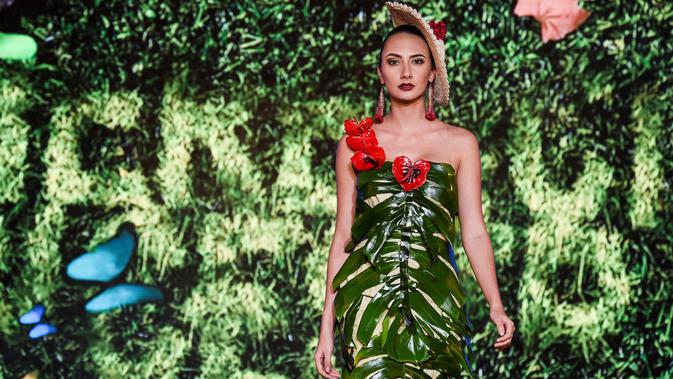 Seorang model memperagakan busana rancangan desainer Kolombia, Camila Gonzale selama BioFashion Show di Cali pada 17 November 2018. Ajang ini menampilkan gaun-gaun unik yang terbuat dari tanaman hidup, bunga dan unsur organik lain. (Luis ROBAYO/AFP)
