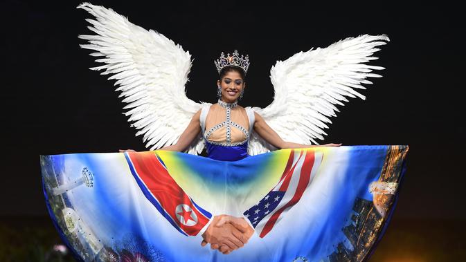 Miss Laos, On-anong Homsombath menampilkan kostum nasionalnya saat National Costume Show Miss Universe 2018 di Chonburi, Thailand, Senin (10/12). 94 wanita cantik se-dunia berlomba menjadi yang terbaik di ajang Miss Universe 2018 (Lillian SUWANRUMPHA/AFP)