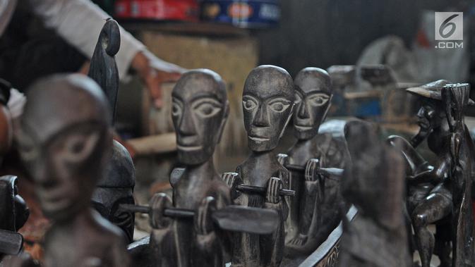 Perajin patung, Oman Sumarna memperlihatkan hasil karyanya di Sanggar Primitif, Sawangan, Depok, Rabu (9/1). Harga patung-patung buatan Oman itu dijual dengan harga bervariasi tergantung tingkat kesulitan pembuatannya. (Liputan6.com/Herman Zakharia)