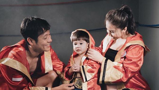 Dalam foto tersebut, ketiganya kompak memakai kimono petinju berwarna jingga. Sang suami, Junior Liem terlihat memakaikan sabuk pinggang petinju kepada Iori. Sementara, Putri terlihat memakaikan tudung ke kepala Iori.