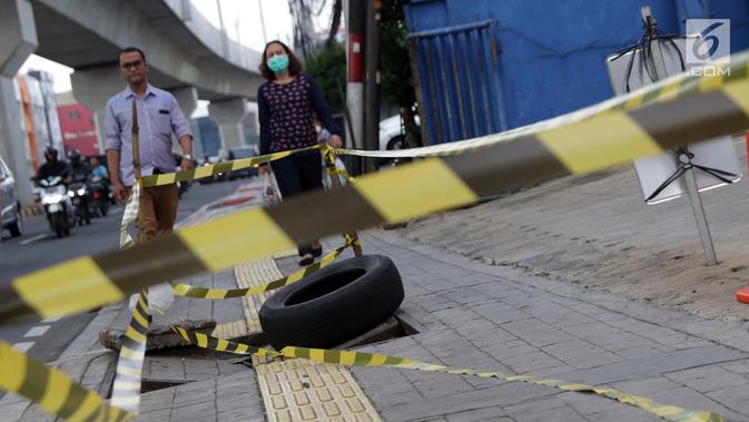 Pengendara melintas di dekat penutup trotoar yang rusak di kawasan Jalan RS Fatmawati, Jakarta, Selasa (14/5/2019). Dua buah penutup trotoar di Jalan RS Fatmawati rusak parah, kondisi ini mengganggu kenyamanan dan membahayakan pejalan kaki, terutama pada malam hari. (Liputan6.com/Helmi Fithriansyah)