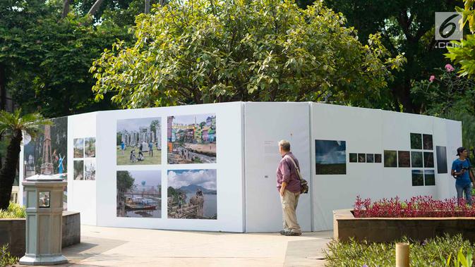 Sejumlah foto dipajang dalam pameran bertajuk 'Identitas' pada acara Jakarta International Photo Festival (JIPFest) 2019 di Taman Menteng, Jakarta, Rabu (3/7/2019). JIPFest 2019 berlangsung pada 25 Juni hingga 9 Juli 2019. (Liputan6.com/Immanuel Antonius)