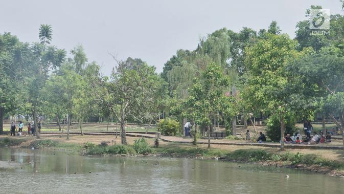Warga memancing di danau Taman Cempaka, Cipayung, Jakarta Timur, Minggu (7/7/2019). Selain dikelilingi pepohonan yang rindang, taman ini dilengkapi berbagai sarana seperti trek jogging, wahana bermain anak, hingga danau buatan yang ramai didatangi warga untuk memancing. (merdeka.com/Iqbal S Nugroho)