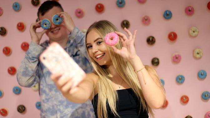 Pengunjung mengambil gambar ketika mengunjungi The Selfie Factory di pusat perbelanjaan Westfield, London pada 11 September 2019. Tersedia 20 booth tematik, dengan latar belakang unik dan berbeda, dari dinding donat hingga restoran bergaya 1950-an. (Isabel INFANTES / AFP)
