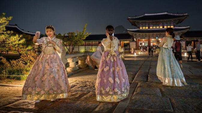 Pengunjung mengenakan gaun tradisional Korea, hanbok sambil berpose saat kunjungan malam ke Istana Gyeongbokgung di Seoul, 4 Oktober 2019. Kunjungan malam tersedia pada minggu ketiga dan keempat setiap bulan mulai dari 26 April sampai 31 Oktober, kecuali pada bulan Agustus. (Photo by Ed JONES / AFP)