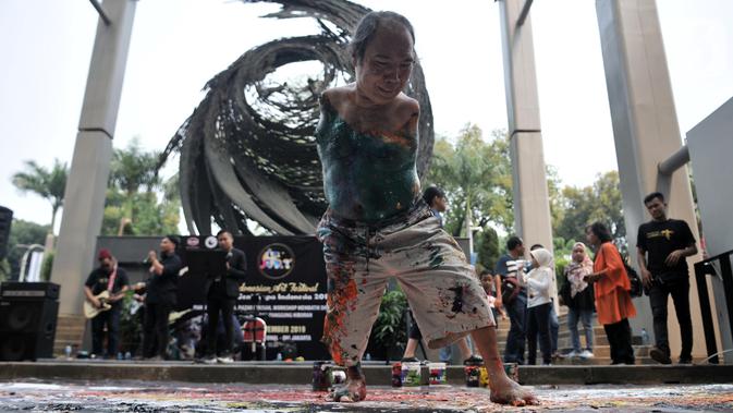 Sadikin Pard (53) membuat karya lukisan dengan kedua kakinya saat Indonesian Art Festival di Museum Nasional, Jakarta, Minggu (10/11/2019). Sadikin kini tergabung dalam Bengkel Pelukis Militan Indonesia, kelompok penggelar Indonesian Art Festival. (merdeka.com/Iqbal S. Nugroho)