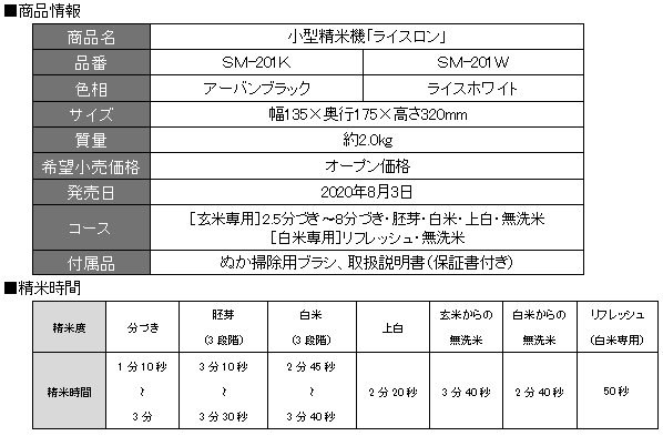 エムケー精工株式会社(本社:長野県千曲市、代表取締役:丸山将一)は、0.5合~2合の精米ができる小型精米機「ライスロン」をリニューアルし、8月3日から全国の家電量販店ほかで発売します。