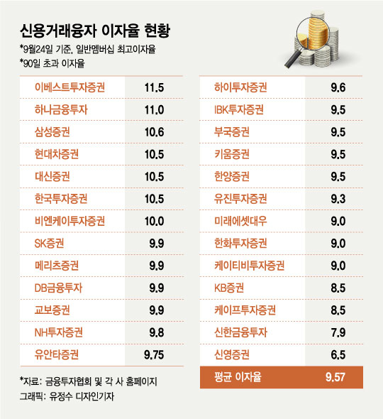 실제 금융투자협회와 각 증권사 홈페이지를 조사한 결과 26개 증권사의 90일 초과 기준 신용융자 이자율은 평균 9.57%다.