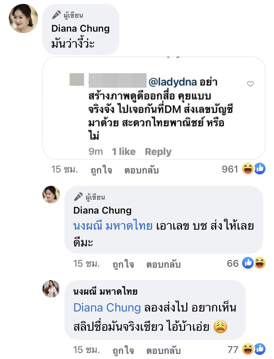 ก่อนที่เจ้าตัวจะโชว์การตอบโต้บกับโรคจิตคนดังกล่าว พร้อมบอกจะเอาเงินส่วนนี้ไปซื้อเครื่องช่วยหายใจให้ผู้ป่วย พร้อมส่งเลขบัญชีกลับไป แถมงานนี้น้องสาวคนสนิท จ๊ะ นงผณี ก็เข้ามาแสดงความคิดเห็นด้วย