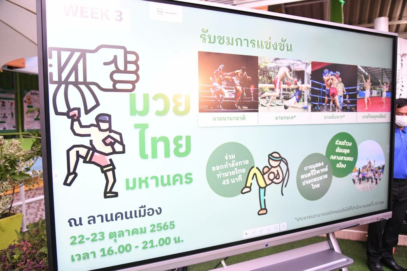 สัปดาห์ที่ 4 กิจกรรม “มวยไทย มหานคร” วันที่ 22-23 ต.ค.65 ณ ลานคนเมือง ศาลาว่าการกรุงเทพมหานคร เขตพระนครพบกับการแข่งขันมวยไทยนานาชาติ ในวันที่ 22 ต.ค.65 คู่เอกหญิง รุ่งนภา พ. เมืองเพชร ชิงแชมป์ มากาเร็ต วาเน็ก รุ่น 112 ปอนด์ คู่รอง จิตติ ค.ส.เชียงใหม่ พบ เนจิน ร.ร.มวยไทยสิงห์บุรี รุ่น 127 ปอนด์ คู่ค้ำ ดังมิลล์ เพชรหนองกี่ พบ เมจิ ม.ราชภัฏจอมบึง รุ่น 105 ปอนด์ ในวันที่ 23 ต.ค.65 คู่เอกหญิง ปรายฟ้า ส.นิตยา ชิงแชมป์ มาลีฮาย เน็ส รุ่น 126 ปอนด์ คู่รอง ร้อยแก้ว ดร.น๊อดมวยไทย พบ เพชรยอดหญิง เพชรหนองกี่ รุ่น 100 ปอนด์ คู่ค้ำ งามตา ลูกคลองตัน พบ กุหลาบขาว รุ่น 100 ปอนด์ นอกจากนี้พบนิทรรศการ “มวยไทย” กิจกรรม Workshop สอนแม่ไม้มวยไทย และร่วมสนุกกับกิจกรรมในบูธกิจกรรม การแข่งขันมวยทะเลและมวยตับจาก กีฬาไทยที่ควรค่าแก่อนุรักษ์ โดยมีนักมวยสมัครเล่นเป็นประชาชนในพื้นที่ 50 เขตทั่วกรุงเทพฯ พร้อมชิงถ้วยและเงินรางวัล (สมัครแข่งได้ที่สำนักงานเขต) การประกวดมวยไทยยุทธศิลป์ชิงแชมป์กรุงเทพมหานคร กิจกรรมที่เป็นการประยุกต์ท่าแม่ไม้มวยไทยมาเป็นศิลปะการแสดง พร้อมชิงถ้วยและเงินรางวัล การออกร้านจำหน่ายสินค้าของดี 50 เขต เพื่อกระตุ้นเศรษฐกิจและเผยแพร่อัตลักษณ์ของพื้นที่ การแสดงดนตรีโปงลาง รำวงย้อนยุค และพบกับศิลปินรับเชิญ เพื่อสร้างความสนุกสนาน สร้างความสุขให้กับคนกรุงเทพฯ