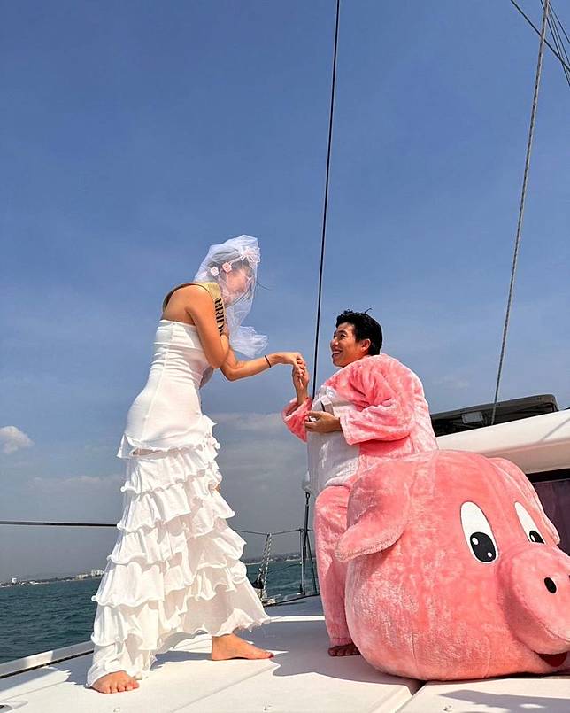 ทำเซอร์ไพรส์สวมชุดหมูคุกเข่าขอแฟนสาว "น้องมิลค์" แต่งงาน ท่ามกลางบรรยากาศโรแมนติกบนเรือยอร์ชและการแสดงความยินดีจากกลุ่มเพื่อนที่มาร่วมเป็นสักขีพยานด้วย